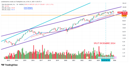 Veamos esa Temporalidad Mensual, Su canal Alcista es indiscutible y su Soporte Inicial en forma de Doble Suelo de Medio plazo muy claro. Podemos observar que tenemos un Nuevo Split en Diciembre de 2024 que dejó nuevamente un precio de cotización muy interesante.