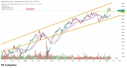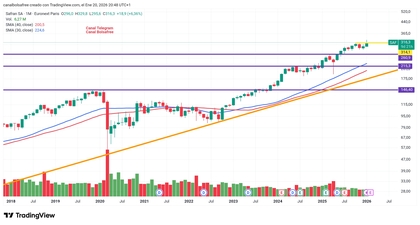 Temporalidad Semanal en la que apreciamos un claro Canal Alcista tras Covid que nos deja un margen hasta los 360€ aproximadamente, después, en zona alta del canal deberemos prestar atención por si decide corregir. Podemos observar la clara zona situada en los 260€ comentada y un punto más cercano de Soporte situado en las Medias de 30/40 semanas.