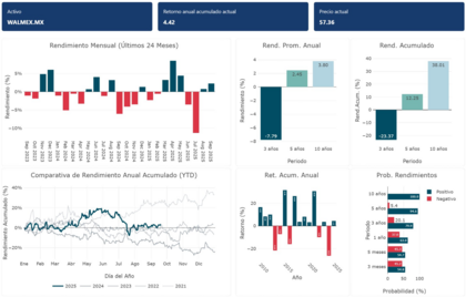 Rendimiento mensual (últimos 24 meses): Este gráfico es como una electrocardiograma de la acción. Vemos meses de ganancias (barras azules verdes) y pérdidas (barras rojas). Por ejemplo, a finales de 2023 y principios de 2025, Walmex mostró un comportamiento mixto, con meses de rendimientos negativos significativos, como en abril y julio de 2024, y una fuerte caída en junio de 2025. Esto nos habla de una acción con movimientos constantes, sensible a los ciclos de consumo y noticias del sector.