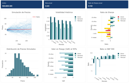 Interpretación: A mayor volatilidad, mayor riesgo. En el gráfico, vemos que la volatilidad de Walmex, medida de forma diaria, semanal y mensual, tiende a disminuir a medida que el periodo de análisis es más largo. Por ejemplo, la volatilidad mensual a 15 años es considerablemente menor que la volatilidad diaria a 5 meses. Esto refuerza la idea de que es un activo que, si bien tiene fluctuaciones a corto plazo, tiende a ser más estable en horizontes temporales mayores.