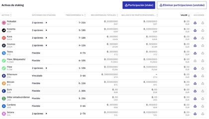 Ofrece staking para unas 20 criptomonedas, incluyendo DOT, ADA, SOL, ATOM, KAVA, XTZ y otras altcoins, además de algunas monedas fiat como euros o dólares (en modalidad de “staking en custodia”, que en realidad funciona como un préstamo o lending).