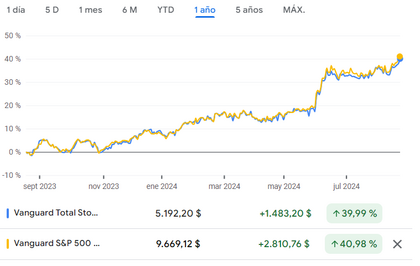 A mi parecer tiene que ver con los retornos históricos y que un fondo tiene una representación más integral del mercado de valores estadounidense, mientras que el otro únicamente se enfoca en el principal índice de referencia de Estados Unidos.