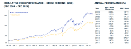 Históricamente, el factor momentum ha mostrado un rendimiento consistente y significativo en diferentes mercados. Por ejemplo, el índice MSCI World Momentum superó a otros factores y a su índice de referencia desde el 2011. A pesar de enfrentar "crashes" en algunos periodos, no ha enfrentado rangos prolongados de mal desempeño como el factor Value y Smallcaps hasta el momento.