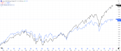 En el mercado alcista más reciente, el SPY ha dominado, pero en el mercado alcista que apareció después de la caída de la Gran Crisis Financiera del 2008, el RSP fue el que llevaba la delantera. Algo similar pasó en los dos mercados bajistas correspondientes.