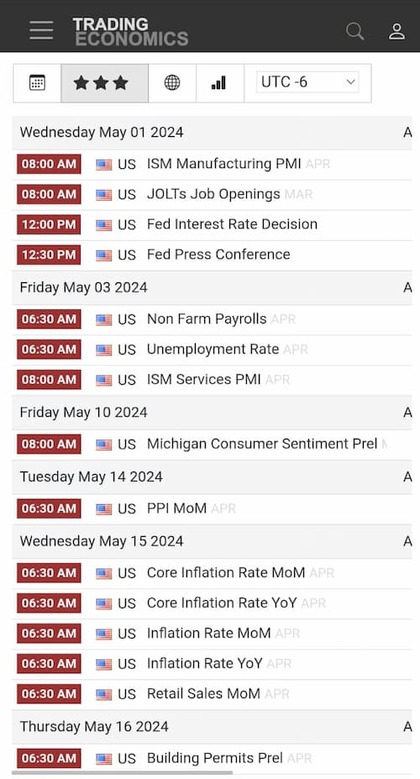...pueden disparar la volatilidad. Uno de los sitios más usados para seguir estos eventos es Trading Economics, donde puedes filtrar los datos más relevantes, configurar alertas y revisar el historial de impacto de cada indicador.
