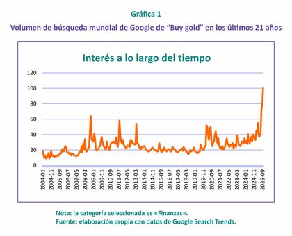 Independientemente de cuál sea su postura personal, y, desde luego, no pretendiendo causar ningún tipo de «influencia» en la misma, la mejor explicación para todo es lo más simple (y lo más evidente). Y, en ese sentido, cuando todo mundo está hablando de un tema, si bien cada vez más abierto, pero que sigue y seguirá siendo especializado, como, por ejemplo, la inversión en oro es que, posiblemente, se avecine el momento de la cordura (Gráfica 1).