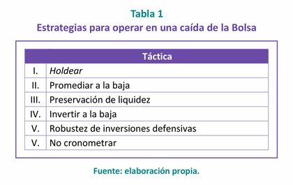 I. Ésta sería la única estrategia por ejecutar para aquel que esté invertido por un horizonte temporal de largo plazo, la cual se reduce a «no hacer nada». Si usted se enfoca en instrumentos cuya tesis de inversión sea pasiva, es, seguramente, porque confía en el crecimiento de largo plazo del índice al cual está expuesto, por lo que venderlos ante el surgimiento de una caída no sería una decisión inteligente, dado el elemento de ciclicidad del mercado, a su vez, lo más idóneo sería dejar intacto su portafolio de inversión o bien, promediarlo a la baja (aumentar si ya se hace).