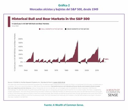 El retorno positivo pasado dista de garantizar un retorno positivo futuro, pero, históricamente y pese a todas las adversidades, el mercado ha tendido a oscilar en un bull market (Gráfica 2).