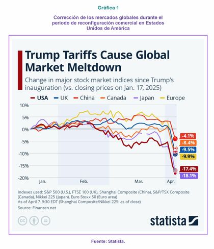 Un ejemplo de esto es lo que sucedió a lo largo del 1T25, con el regreso de Donald Trump al poder y con él, la implementación de una política comercial proteccionista en la Unión Americana, lo que ocasionó (y sigue ocasionando, hasta cierto punto) volatilidad y pesimismo en los mercados financieros globales, llegando a registrar caídas promedio del orden de 11.23% (Gráfica 1).