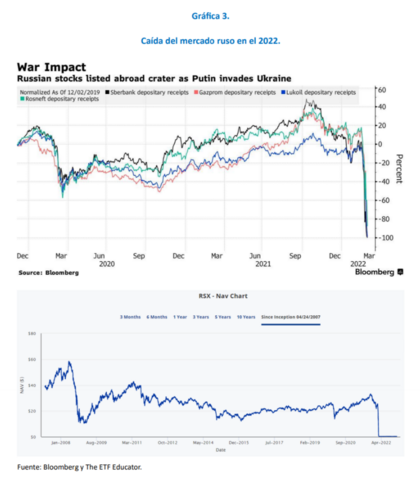 Así también, el Fondo Cotizado en Bolsa (ETF, por sus siglas en inglés) identitario del mercado ruso, RSX, de mover entre US$ 50M y US$ 200M de volumen diarios, fue deslistado y puesto en liquidación, dejándoles pérdidas irreparables a miles de inversionistas.