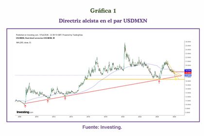 Adentrándome en este último punto, destaca la convergencia de los niveles actuales con la línea de tendencia que ha definido el rumbo del par USDMXN desde septiembre de 2008, pues cada vez que la toca suele devenir un periodo de depreciación cambiaria (Gráfica 1).