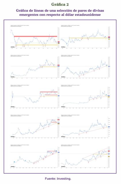 La respuesta es «no», pues al realizar el mismo análisis a una lista selecta de divisas emergentes, encontramos aspectos técnicos similares, con excepción quizá (estrictamente chartista) del USDHFR, USDPLN y USDTHB (Gráfica 2).