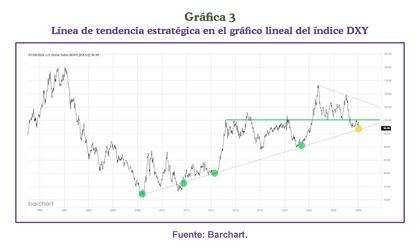 Dicho lo anterior, se deduciría entonces que se trata más de un fenómeno estructural de la moneda reina que de uno de alguna moneda emergente o del peso mexicano. Tras prácticamente 3 años y 3 meses de debilidad, hoy, el índice DXY, oscilando en niveles de 96.99 puntos, se sitúa en un punto de inflexión clave que desde el 2008 en 4 ocasiones diferentes (y simultáneas) ha fungido como impulsor alcista (Gráfica 3).