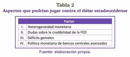 Ahora bien, claramente y hasta cierto punto, el entorno macroeconómico parece favorecedor para el dólar estadounidense; no obstante, es importante analizar cuáles podrían ser las variables que dificultarían su recuperación (Tabla 2):