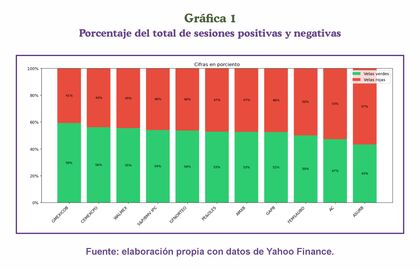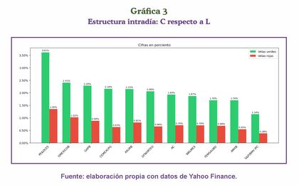 Partiendo del punto inicial, por separado, en las 10 acciones se comenzará a analizar con mayor rigor las sesiones bursátiles positivas (verdes) en el periodo que comprende la tendencia de corto plazo del S&P/BMV IPC (09 de abril de 2025 al 10 de abril de 2026, sumando 250 sesiones bursátiles) a fin de identificar en cuáles y cada cuándo se presenta la mayor brecha entre el precio más bajo (L) y el precio de cierre (C), esto con el objeto de calibrar, en términos meramente cuantitativos, cuáles son las más susceptibles para generar retornos intradiarios competitivos con respecto al mercado (Figura 1).