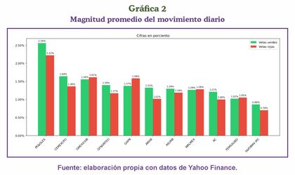 Buscando entonces ahora entender qué tanto (hacia arriba y hacia abajo) se mueven estas acciones, se compararán el tamaño promedio de las subidas contra el de las caídas (Gráfica 2).