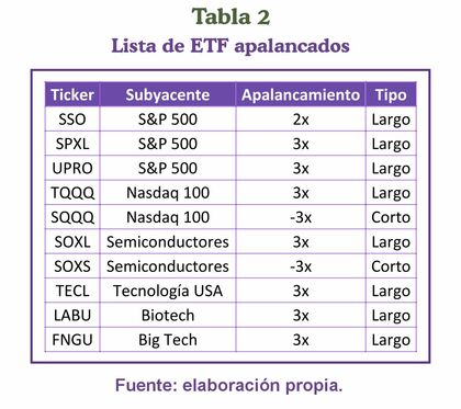 A diferencia de los ETF tradicionales, que la lista es muy extensa, en los apalancados es lo contrario, hecho que se explica por su naturaleza y función específica en una estrategia de inversión. Dentro de sus principales variantes se encuentran los indexados y los sectoriales (Tabla 2).