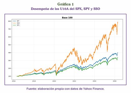 Como es de esperarse, el SPX y el SPY guardan un comportamiento muy similar, pues éste, en su papel de replicador, busca seguir e igualar los retornos diarios ofrecidos por su subyacente. Con respecto al SSO, su trayectoria es pronunciada, con álgidos avances durante los ciclos alcistas, pero con profundas caídas durante los ciclos bajistas; bajo una óptica general, podría aseverarse que esto se debe a que simplemente «multiplica por 2» al S&P 500, pero eso dista de ser así, pues su desempeño acumulado es el resultado de una serie de movimientos diarios amplificados, los cuales al encadenarse generan una trayectoria propia que, con el pasar del tiempo, crea una brecha con su subyacente (Gráfica 1).