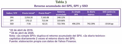 Ahora, concentrándonos en el retorno total, el SSO, frente a una trayectoria teórica que capitaliza a diario el doble del movimiento del referencial bursátil americano, no la supera, sino que queda ligeramente por debajo. Este acontecimiento podría explicarse a razón de costos implícitos o rebalanceos (Tabla 3).