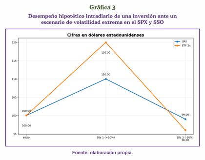 Para cerrar, una gráfica intuitiva pero poderosa. Claramente, un ETF apalancado muestra resultados más notorios (bajo la lógica ya explicada) en escenarios volátiles, aunque basta con que el subyacente oscile para que se vean reflejados, por lo que el retorno obtenido dependerá de su trayectoria y no de un precio de cierre del subyacente (Gráfica 3).