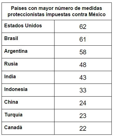 Según un reporte elaborado por el Centro de Investigación en Política Económica, Estados Unidos encabeza la lista de los países que más han afectado a México con medidas proteccionistas. El país vecino ha impuesto 62 medidas proteccionistas, le sigue Brasil (61), Argentina (58), Rusia (48), India (43) e Indonesia (33).