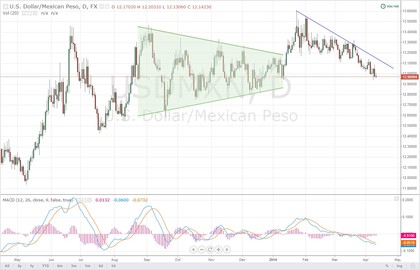 El Dólar/Mexicano (USDMXN) mantiene su camino bajista y llega a 12.9734. En el gráfico podemos ver claramente un triángulo simétrico ascendente formado desde septiembre de 2013 hasta principios de enero de este año, que rompe a mediados de mes y tiene una importante subida hasta el 23 de enero, alcanzando el máximo de 13.6040 (máximo en lo que llevamos de año). Desde ese momento el cruce de divisas tiende a la baja, sin prácticas correcciones del precio al alza. El indicador MACD nos señala posición compradora en el par, aunque la tendencia y el mismo precio de la divisa nos orientan hacia la venta. De momento, opción de entrar en cortos aunque no es exactamente el par más atractivo con el dólar.